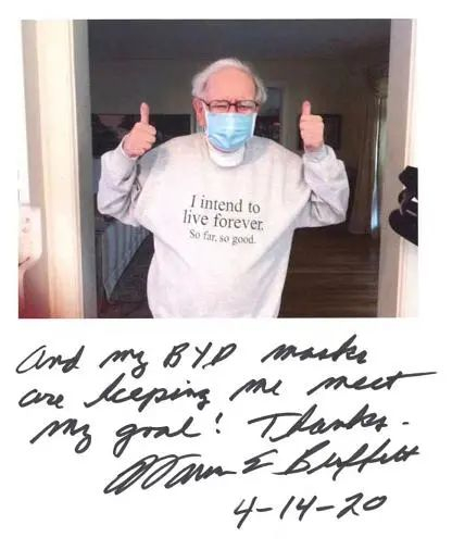 4月14日,巴菲特晒出一张戴着比亚迪所产口罩的照片。他的白T恤上印着“我想长命百岁,目前为止还不错”。巴菲特写到“现在我的比亚迪口罩正助我达成目标,谢谢!”