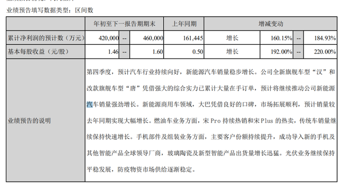 对于作出上述全年业绩预告的原因,比亚迪表示,第四季度,预计汽车行业持续向好,新能源汽车销量稳步增长。公司全新旗舰车型“汉”和改款旗舰车型“唐”凭借强大的综合实力已累计大量在手订单,预计将继续推动公司新能源汽车销量强劲增长。新能源商用车领域,大巴凭借良好的口碑,市场拓展顺利,预计销量较去年同期实现大幅增长。燃油车业务方面,宋Pro持续热销和宋Plus的热卖,传统车销量继续保持快速增长。手机部件及组装业务方面,主要客户份额持续提升,成功导入新的手机及其他智能产品全球领导厂商,玻璃陶瓷及新型智能产品出货量增长迅猛。光伏业务继续保持平稳发展,防疫物资市场供给逐渐稳定。
