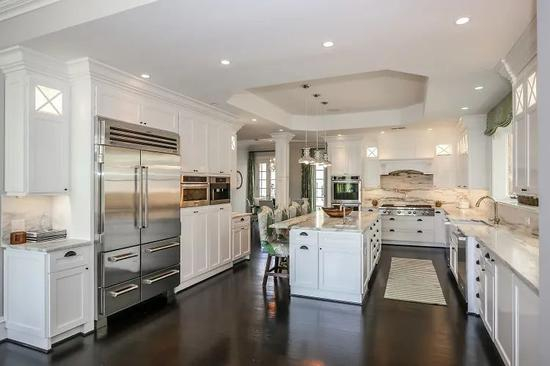 这座高冷,甚至有点小清新的别墅,拥有一个现代化的厨房,带有隐藏式照明,宽敞的厨房岛和一流的设备。