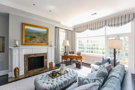 轻奢的客厅尽是各类灰色的家居单品,看似简单的步入式壁炉,由旧石砌成,据报道,它是为拉斐特在布兰迪万战场上设计的。而松木地板是从多佛的一家法院收回的,可谓是每个物件都有它自己的故事。