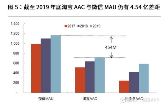 截至2019年底,淘宝年度活跃用户的数量仍比微信月度活跃用户的数量低4.54亿。这意味着在县域及以下城市,电商的覆盖明显不足。
