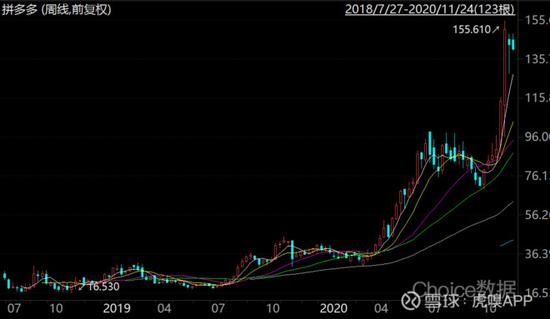 从股价走势图也可以看出这一点,2019年8月,拼多多发布的二季报显示,其营收同比增长169%,同时亏损大幅收窄,之后股价则一路走高。其最近一次的股价爆发(11月13日单日上涨20.41%),同样也是由于三季报首次盈利。