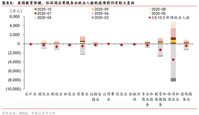 (3)高弹性:服务业就业具有较强的弹性,加速劳动市场恢复速度。尽管当前服务业恢复速度慢于其他产业,但就业相对更加具有弹性,近期辉瑞公司(代码:PFE)宣布研发的新冠候选疫苗BNT162b2有效率超90%,预计疫苗投入使用后服务业恢复将进一步加快。