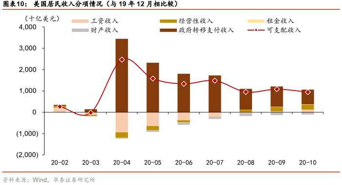 从总体收入来看,10月份美国居民工资收入、经营性收入等分项已经比去年12月略高,恢复情况稳健。加之前期政府转移支付叠加高储蓄下,居民部门已经积累一部分收入,随经济修复、工资报酬回升,即使后续财政支持撤火,居民收入也将有所支撑,因此我们预计再次直接向公众发放现金支票的财政举措的必要性较小。不过,由于总体收入无法反应个体失业者的境况,为了维护失业者的利益,额外的失业保险可能仍有一定必要性,但金额可能低于今年的每周600美元。