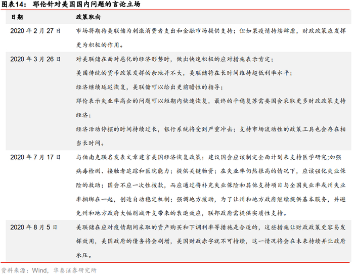 从耶伦的近期言论来看,其对货币政策主张偏鸽派,对财政政策主张偏中性。更关注就业市场疲弱、经济增长乏力的问题。总体来看耶伦今年疫情以来的言论立场支持财政政策保持宽松环境,但仍需坚守财政纪律、注意财政杠杆。耶伦曾在多个场合对美联储采取新一轮宽松持赞同态度,且强调美联储应该继续保持政策独立性,并强调需要财政纾困配合货币政策。具体来看,在今年7月17日曾和伯南克联名发表文章建言美国经济恢复政策,其中提到首先应提供财政支持缓解社区医疗器材、病毒追踪等医疗支出;其次关注失业问题,提出需要短期内完善失业保险覆盖,突破地方州政府和联邦政府之间的限制。