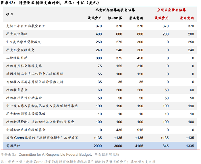 根据美国跨党派公共政策机构尽责联邦预算委员会(Committee for A Responsible Federal Budget)对过往拜登关于各项财政支出的表态进行测算,拜登所支持的财政政策刺激金额区间为2-3.1万亿美元。但鉴于当前分裂国会的情况,以及居民和企业所需财政支持的实际需求,我们对其预测进行一定的调整。其中,中小企业和航空企业救助、失业保险、教育基金、疫情应对资金等是相对必须的财政支出,而针对个人的直接补助、税收减免等支出必要性相对较低,规模可能被压缩。综合来看,我们认为明年美国财政刺激的金额可能位于8450亿美元至1.3万亿美元之间,取决于后续白宫和国会两院的谈判情况,因而我们对拜登财政刺激抱有一定期待,但是相对有限、不会大水漫灌。