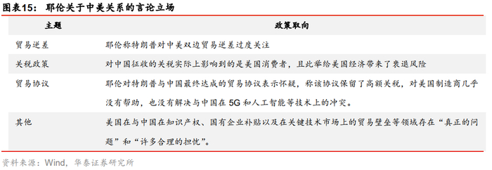 综合耶伦的言论可以看出:第一,耶伦是开放贸易和国际贸易体系的坚定支持者,其对特朗普征收关税的政策表示批评,对于中美第一阶段协议也持怀疑态度。我们认为,其上台后可能致力于降低中美之间的双向关税壁垒,并有可能推动第一阶段协议的重新审视和修订,在降低关税的基础上为美国制造业提供更多的利益。这意味着关税降低和美国制造业回流或有所加速。第二,耶伦对技术市场壁垒、知识产权和国有企业补贴等领域存在一定的担忧,其上台后会或对中国施加一定的压力,倒逼中国进一步完善制度建设如知识产权制度、国企竞争机制等等,国企改革或有所加快。第三,耶伦认同中美在5G和人工智能等技术上存在冲突,因此,制裁中国科技企业的步伐或许并不会停歇。