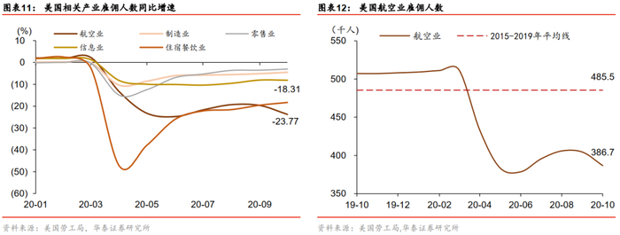 从外生拉力看,美国政府为企业维持经营提供资金支持,以防止企业进行大规模裁员,从而对就业市场起到支撑作用。在疫情冲击之下,广大中小企业和部分航空、能源行业大企业遭受较大损失,白宫则通过针对中小企业的薪酬保障计划(PPP)和航空公司援助等措施防止大面积裁员的发生。10月8日,美国财政部发布公告,获得50,000美元或以下薪酬保障计划(PPP)贷款的小型企业可以申请全额减免,允许符合要求的企业跳过关于FTE(全额职工)的要求,旨在减轻小型企业申请贷款豁免的文书压力,为中小企业的修复提供更多支持,后续来看,我们认为美国政府仍有望继续对中小企业和航空等疫情冲击最严重企业提供支持,以防止失业率大幅攀升。