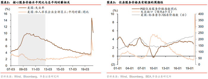 第二,住房服务价格具有较强的周期性,料对后续服务通胀形成一定拖累。我们对比住房服务价格指数与失业缺口之间的关系,发现失业缺口与滞后六个月的住房价格之间存在较强的负相关关系,说明住房服务价格与经济周期较为相关。往后看经济周期,美国正步入复苏区间,但失业率修复至自然失业率的进程仍较为漫长,住房服务通胀或长期低于疫情前水平。此外,纽约州和洛杉矶等政府出台租金减免和租金锁定(控制房租涨幅)政策将进一步抑制住房服务价格的上涨。基于住房服务价格在在核心服务PCE中占比达30%,我们认为住房服务价格低迷或对未来核心服务通胀形成一定拖累。
