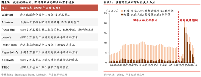 (2)临时性:临时失业为就业市场修复提供更多的动能,与08年金融危机不同的是,本次疫情冲击下失业更多以临时性失业为主,修复空间相对较大。当前的临时性失业人数为08年金融危机后的两倍以上,仍有一定的下降空间;