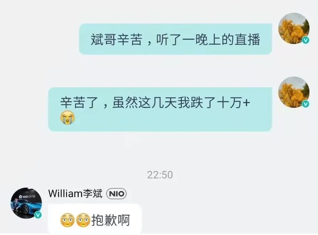 那天,我在蔚来车主群里给李斌留言:“斌哥辛苦,听了一晚上直播。虽然这几天我亏了十万+”。没过多久,李斌随后在群里回复:“抱歉啊”三字。