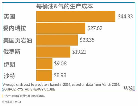 相比下来,石油储量排名第一位的委内瑞拉和排第三位的加拿大,所储存的都是劣质油砂,开采成本极高,委内瑞拉的成本(27.62美元/桶)相当于沙特的三倍,加拿大(41美元/桶)相当于沙特的四倍。