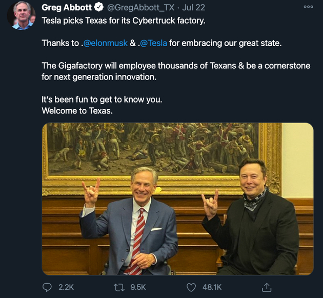 最终加州政府默许了马斯克的强行复工行为,没有对这一公开违反疫情管制的行为实施任何惩罚。但马斯克和地方政府的防疫冲突,也引发了德州官员的争相示好。从德州联邦参议员克鲁兹(Ted Cruz)到德州州长阿伯特(Greg Abbott)到地方官员,都在热情欢迎这位美国商界领袖来到德州。