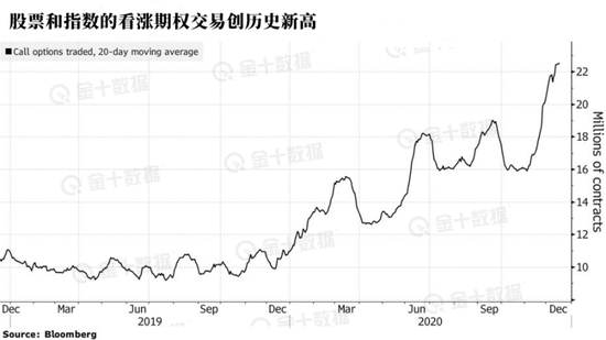 看涨的散户投资者不仅活跃于股市之中,今年还前所未有地进入到复杂的衍生品市场。过去20天,美国各交易所日均成交约2200万份看涨合约,创历史新高。