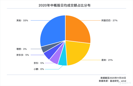 整个中概板块年初至今的日均成交额为168亿美元,成交额排名前三的分别是阿里巴巴(45亿美元)、蔚来(35亿美元)以及小鹏汽车(9亿美元)。