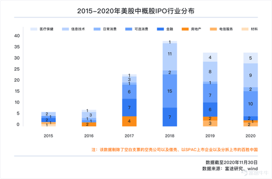 分行业来看,2020年赴美IPO的企业中,信息软件依旧坚挺,第一大行业为教育和新消费领携的可选消费,而疫情下医药股受益IPO数量创下新高。
