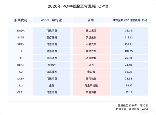 本地配送服务商达达集团凭借Q3亮眼的财报和互联网巨头社区团购混战的强势东风开始狂奔,IPO至11月30日涨幅达到了262.41%,成为今年IPO后涨幅冠军。创新生物药公司天境生物上市后一路走高,成为今年中概股新股中涨幅亚军。新能源汽车领域被誉为今年美股的‘头等舱’。美国市场已有特斯拉这样的相对成熟标的,一路领头狂奔,中概新股小鹏汽车、理想汽车也分别实现了176.91%和118.65%的涨幅。
