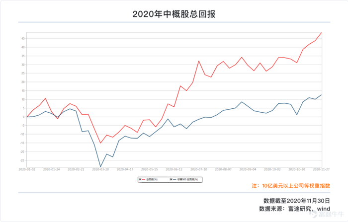 代表中国新经济的中概股,如果选取10亿美元市值以上中概股等权重的配置,在2020年大幅跑赢标准普尔500指数,体现了中国核心资产强大的竞争力。