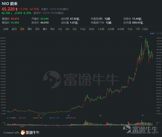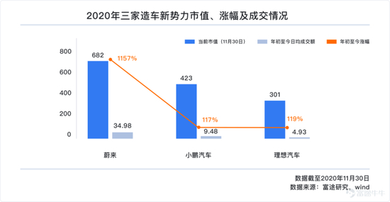 年初至今涨幅约1157%,最低价2.11与最高价57.20之间的波幅高达27倍,在规模以上的公司中,无论在任何角度来看,都是绝对的年度股王,在蔚来的大涨拉动市场情绪后,理想、小鹏陆续上市,三大新能源汽车新势力齐聚美股,除了蔚来,年内上市的小鹏和理想的涨幅也高达177%和119%。中国新能源汽车这个赛道成为了中概股的绝对C位赛道。