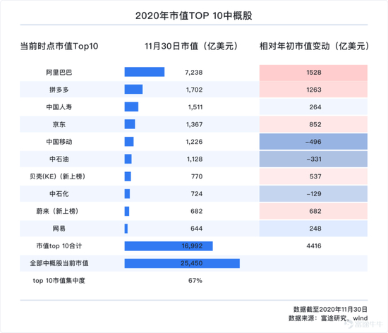 截至2020年11月30日,赴美IPO的中概股累计350家,现存262家,总市值高达2.5万亿美元,相对于今年年初的1.8万亿美元,整体市值增幅高达41%。但市场高度分化,1月至11月涨幅超过整体市值涨幅的仅73家,占比为28%。
