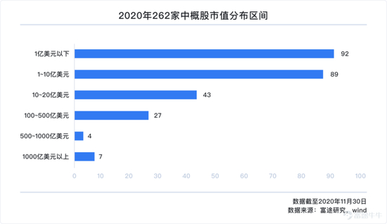 市值分布方面,中概股呈现典型的金字塔形状,低于10亿美元的中概股合计占比约69%。