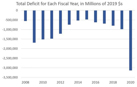 在2020财年,美国政府预算赤字总额超过3.1万亿美元。即使根据通货膨胀进行调整,2020年的总赤字基本上也超出了正常范围。