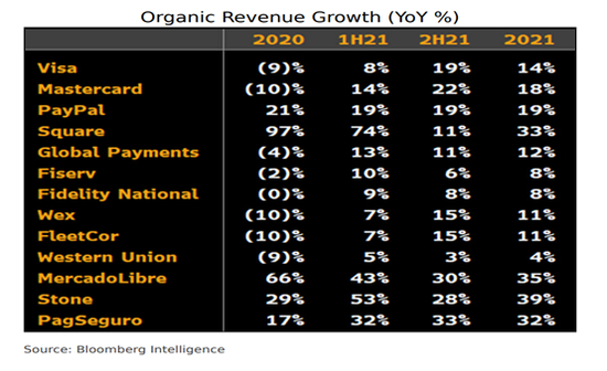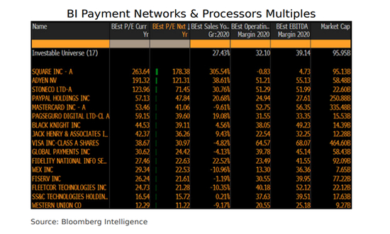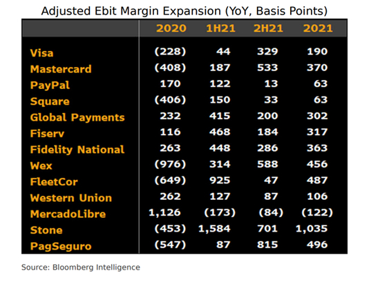 支付金融科技公司的高固定成本模式意味着2021年更多的营收将带来利润率的扩张,但可能没有一家能与巴西处理商StoneCo(STNE.O)和PagSeguro(PAGS.O)相提并论。尽管交易量增长强劲,但利润率却因人们从信贷交易转向借记交易而受到挤压。一旦银行信贷恢复,刺激资金消耗殆尽,非必需支出改善,在新的银行产品上有更多的投资,这种情况应该会逆转。Paypal(PYPL.O)和Square(SQ.N)的利润率增长可以持续,但它们的扩张可能在2021年只有63个基点。我们认为,随着更多的数字钱包货币化和高利润信贷发行的回归,有可能出现上升空间。