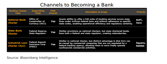 我们认为,随着非银行企业推出银行类服务,银行界的竞争将会在未来几年白热化。对于电子钱包供应商来说,如Paypal(PYPL.O)与Square(SQ.N),这是实现强劲增长的关键一役。对于那些新型银行(基于金融科技的银行)而言,这可能会带来更多高利润贷款资产,以创造更多的净利润,对于SoFi和Varo这样的新兴银行来说,会为银行牌照带来更大的价值。