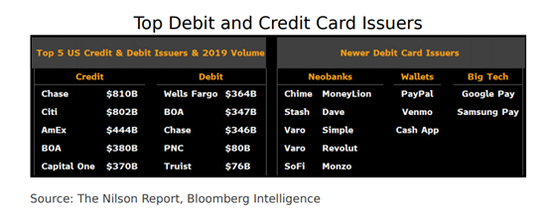 如果借记卡继续成为首选卡,信用卡账户数量可能会减少,大型信用卡发卡机构银行将面临压力。虽然银行也是主要的借记卡发卡机构,但借记卡产生的交换费较少,逾期罚款等其他费用较少,而且没有利息收入。借记卡作为现金替代品,其成长对Visa(V.N)和万事达(MA.N)的份额来说是一个积极的因素,因为无论是哪种卡,这两家公司都能获得类似的费用。