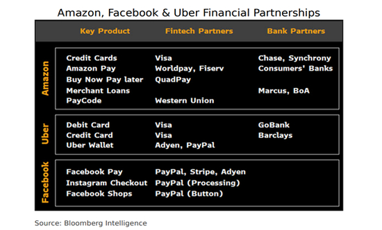 银行业务可助亚马逊、Facebook和Uber发展核心业务