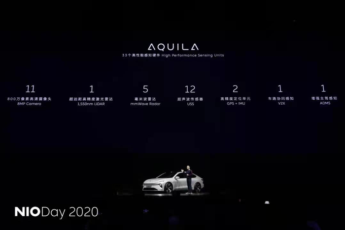 ET7基于第二代高效电驱平台打造,最大的看点是搭载了蔚来最新的自动驾驶技术。新车采用蔚来自主研发的Aquila超感系统,拥有33个高精度传感器,包括11颗超感镜头总像素数高达8800万、1 个超远距离高精度激光雷达。