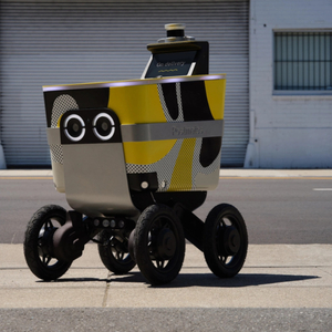 PostMates X研发了一款带有黑黄花纹的自动人行道送货机器人,这款机器人最近与Pink Dot Stores合作在西好莱坞开展送货服务,或将成为新公司Serve Robotics的核心产品。