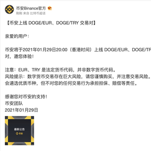 鉴于狗狗币的火爆行情,币安Binance官方微博宣布,币安将于2021年01月29日20:00上线DOGE/EUR、DOGE/TRY交易对。