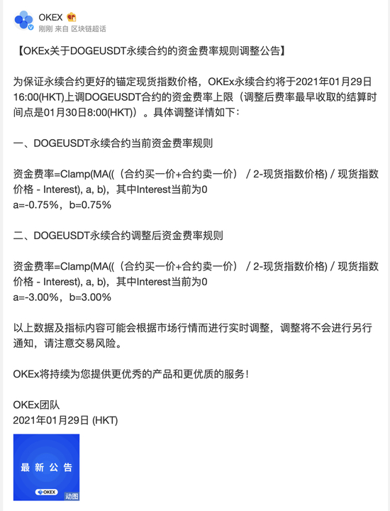 另一家数字货币交易平台OKEx则上调了狗狗币的交易费用。OKEx在微博上发布了关于DOGEUSDT永续合约的资金费率规则调整公告,OKEx永续合约将于2021年01月29日16:00上调DOGEUSDT合约的资金费率上限。