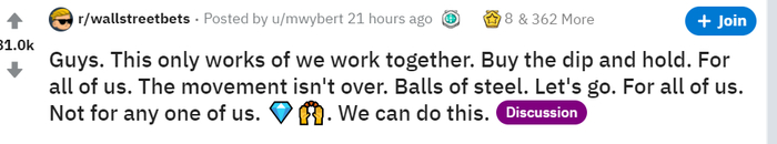 如今,这场逼空浪潮虽然降温了,但仍未彻底结束。尽管GME等股票已经大幅下跌,但Reddit论坛上依然有网友呼吁不要认输。例如,一位名叫“mwybert”的网友就发帖子呼吁其他散户: