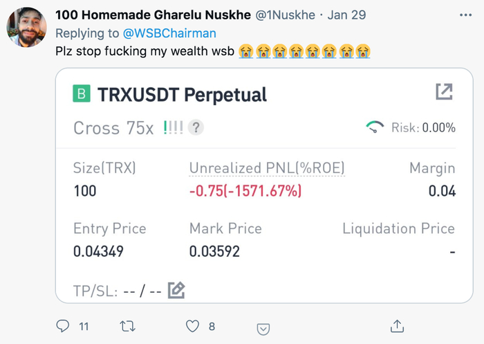 从 Dogecoin 上涨的导火索—— WSBChairman 在推特的发言来看,它与近期兴起于美股的 “WSB 散户战空头” 事件密切相关,可以说是 WSB 在加密货币市场的延续。