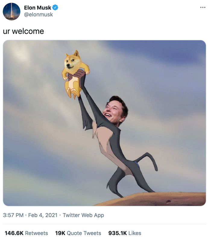 2 月 4 日下午 4 点,当 Dogecoin 已从 6 天前的 0.082 美元高点回落 50 % 至 0.04 美元时,埃隆·马斯克在推特上发了一张恶搞经典电影《狮子王》的图,并配文 “不用谢(ur welcome)”。