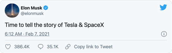 马斯克在Twitter上表示:“是时候讲述特斯拉和SpaceX的故事了。”随后有粉丝向他提问说:“你是要写书吗?”对于这个问题,马斯克给出了明确的答复:“是的。”