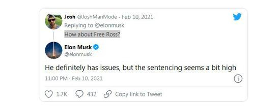 有网友问马斯克:“释放罗斯怎么样?”马斯克回答:“他确实有问题,但量刑似乎有点高。”