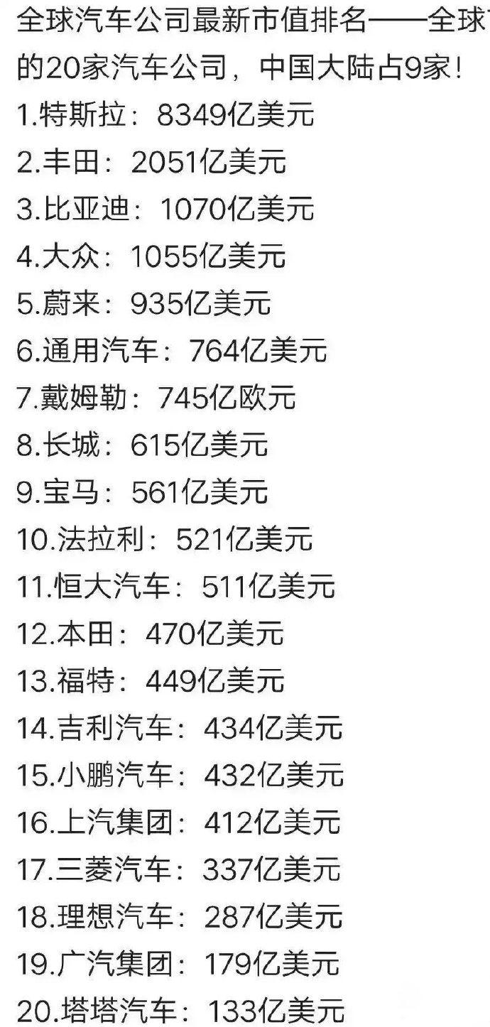 全球市值最高的20家汽车公司,中国数量最多,但质量一般?