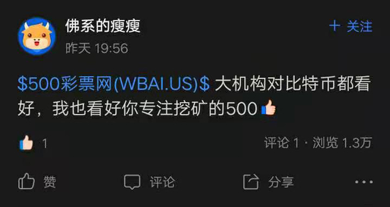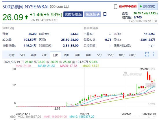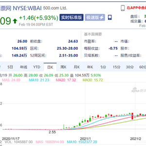 2月16日晚,500彩票网(WBAI)发布一则公告,宣布以约10%的股份收购吴忌寒从比特大陆拆分出的BTC.COM 矿池,包括 BTC.COM 的全部矿池业务,BTC.COM 域名和 BTC.COM 加密货币钱包。这次收购被二级市场解读为重大利好,当日WBAI收涨超35%。截至2月20日收盘,WBMI股价收报26.09美元,涨近6%。