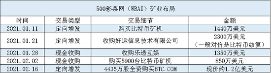 今年1月10日,500彩票网宣布发行价值约1440万美元的A类普通股,收购卖方拥有的比特币挖矿机。1月29日,又以1.05亿港元收购乐透互娱169,354,839股股份。认购完成后,WBAI持股比例将达到约54.2%,成为乐透互娱的控股公司。