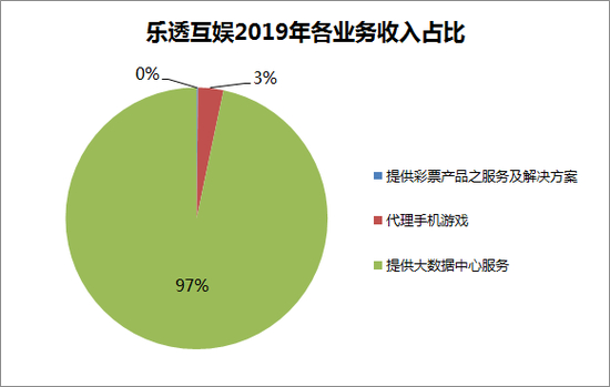 据乐透互娱2018年财报,两项彩票业务收入合计贡献达到91%。但到了2019年,乐透互娱停止了销售彩票终端机及部件的业务,而转型提供大数据中心服务,该项业务贡献收入占比97%。