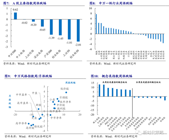 上周A股涨跌不一,其中中证500(0.62%)领涨,创业板50(-2.01%)领跌。申万一级行业中,钢铁(7.72%)领涨,食品饮料(-3.63%)领跌。概念股中,稀土指数(13.28%)、打板指数(13.03%)和乙醇汽油指数(9.47%)领涨,钴指数(-4.29%)领跌。