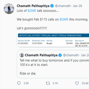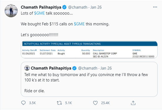 在今年年初的WSB逼空华尔街的大戏中,Palihapitiya在社交媒体上问自己的粉丝:“该买什么股?如果你们说服我的话,我就先扔个几十万美元进去呗。”