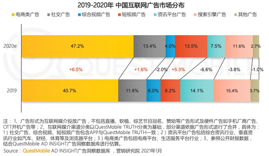 根据QuestMobile的数据,2020年中国互联网广告市场规模5292.1亿元,同比增长5.4%。不过互联网广告市场两极分化,链接交易或具社交属性的电商、短视频及社交广告增幅明显,抢夺了其他媒介市场份额。根据报告,2020年中国互联网广告市场由电商类广告、社交广告、综合视频广告、短视频广告、资讯平台广告、搜索引擎广告和其他广告组成,其中电商类广告市场占比47.2%(yoy+6.5pct),社交广告市场占比13.4%(yoy+1.6pct),短视频广告市场占比13.5%(yoy+5.3pct)。此外,综合视频广告、资讯平台广告、搜索引擎广告、其他广告的市场占比均低于去年,分别下滑2、6.6、3.8、1个百分点。