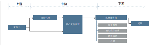 在整个互联网广告行业的价值链里,处于上游的广告主是整条价值链的最初发起者,其需求是通过市场营销来最大程度地实现产品推广及品牌建设。但出于节约成本的目的,广告主通常不会直接与主要媒体发布商联系,而是通过广告代理来进行广告投放。在这一过程中,广告代理通常需要向下游的媒体发布商垫付现金(广告主则不会向广告代理商垫付),媒体发布商再在其平台上将文字、图片或视频等广告文案投放给目标受众。人们便会在电脑、手机等设备上的应用程序里收到各类广告。