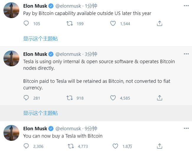 马斯克个人也曾多次公开表示对比特币的“喜爱”,甚至因此被SEC以涉嫌操作虚拟货币为由展开过调查。2021年1月29日,比特币一度跌破至30000美元关口。在此之际,马斯克将自己的推特简介更改为“#bitcoin”,直接把价格拉回了38000美元。2021年2月19日,比特币总市值突破1万亿美元,次日,马斯克将推特头像换为怀抱比特币富豪的动漫人物,并连发两条推文称,“只一天”、“我只想点燃你心中的火焰”,毫不掩饰自己对比特币的看好。
