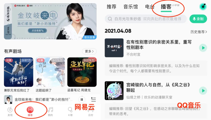 举个简单的例子,我读大学时还流行宿舍熄灯断电后一起听广播,像《刑警803》广播剧就属于内容的前置,有没有主持人无所谓;而情感夜话类节目则属于人的前置,听众追随的是主持人。这两种模式从电台广播一路演变进入互联网播客时代,其消费内核并没有变。整体看,应该说在国内市场上内容因素比人的因素更具竞争优势。但也有像荔枝FM这种不做版权生意、靠音频直播打赏为生的相对小众的声音平台,做差异化竞争,尽管后来其他平台也填补了音频直播的短板,让差异化变成了标配。