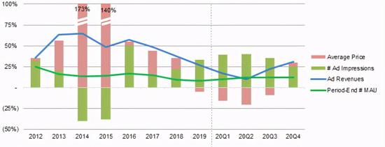 2020年Q4广告收入增长包括广告数量同比增长25%和每个广告平均收入增长5%。